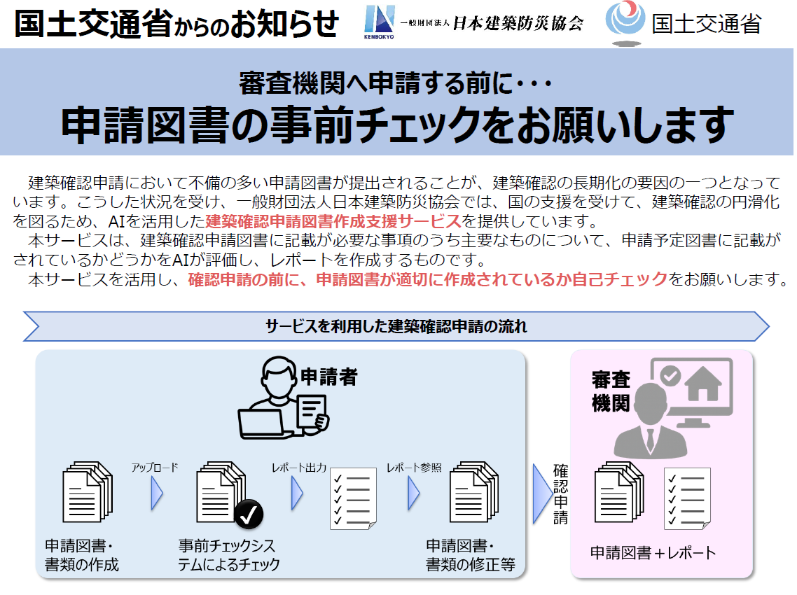 本サービスの利用を通じて確認申請の前に自己チェックが可能です。